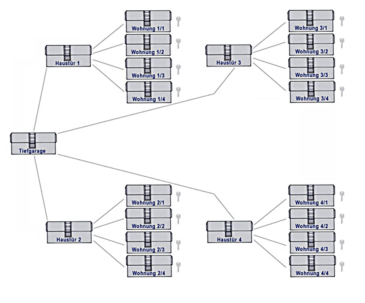 Gleichschließende Zylinder sind häufig in Einfamilienhäusern verbaut. Hier haben Sie einen Schlüssel für alle Zylinder. Nach Kundenwunsch können wir Ihnen zu der Schließung viele Zylinder und Schlüssel produzieren. Jeder Schlüssel schließ jeden Schließzylinder und jeder Zylinder wird von alles Schlüssel geschlossen.