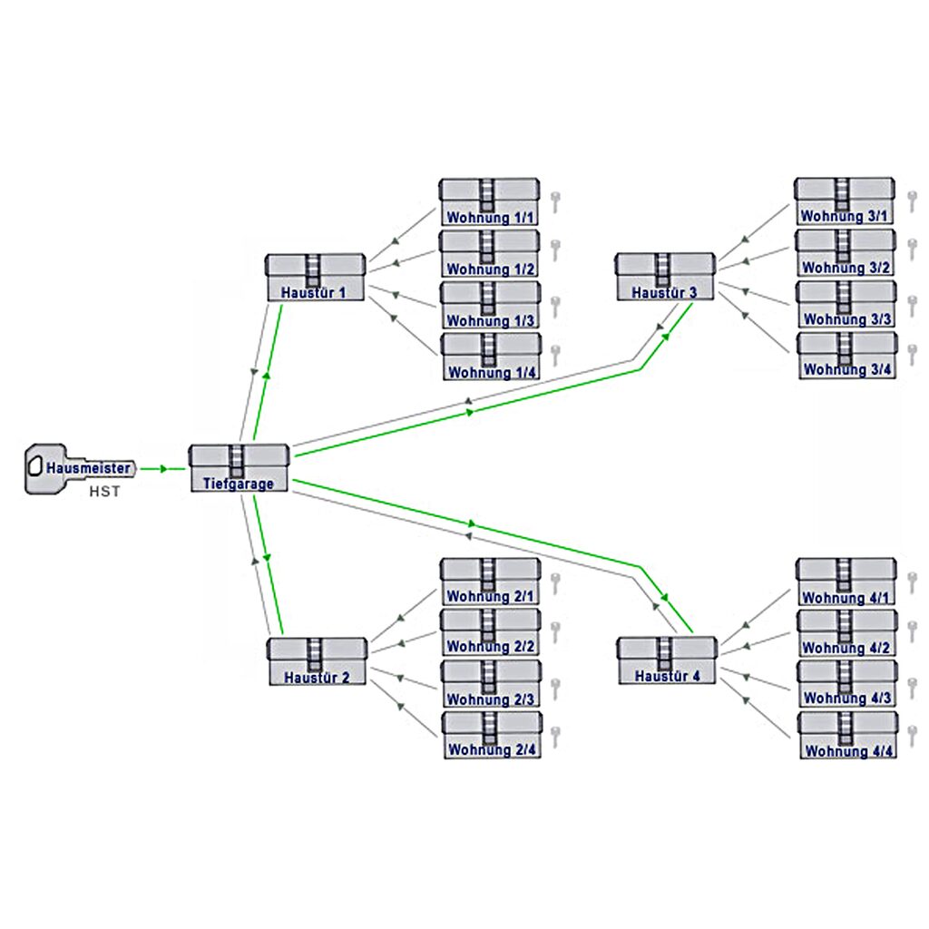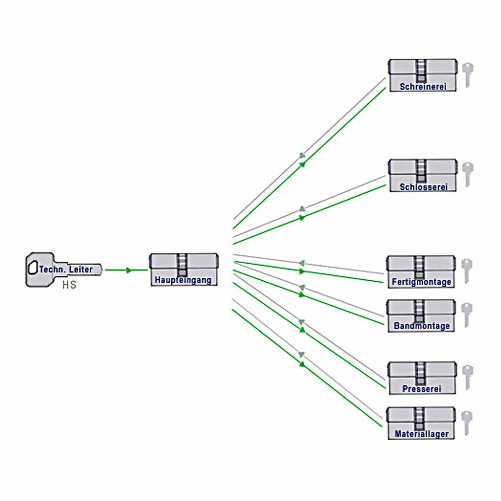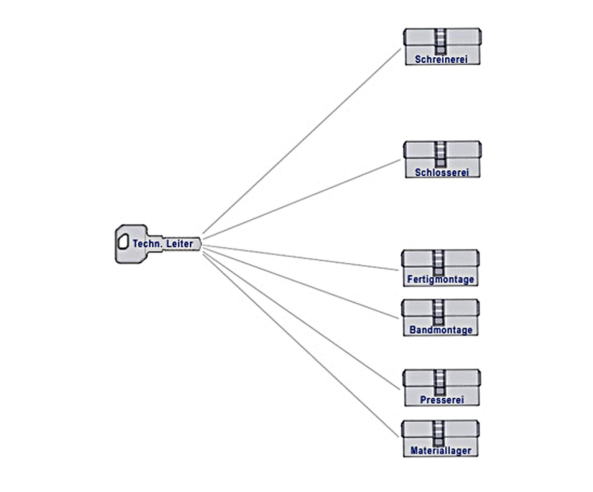 Bei der Hauptschlüsselanlage gibt es unzählige Schließzylinder mit einem eigenen Schlüssel. Dieser Schlüssel schließt den zugehörigen Zylinder. Bei der Anlage gibt es einen Hauptschlüssel der alle Schließzylinder aufschließt. Hauptschlüsselanlagen werden gerne in Praxen, Büros und in Gewerberäumlichkeiten verbaut.